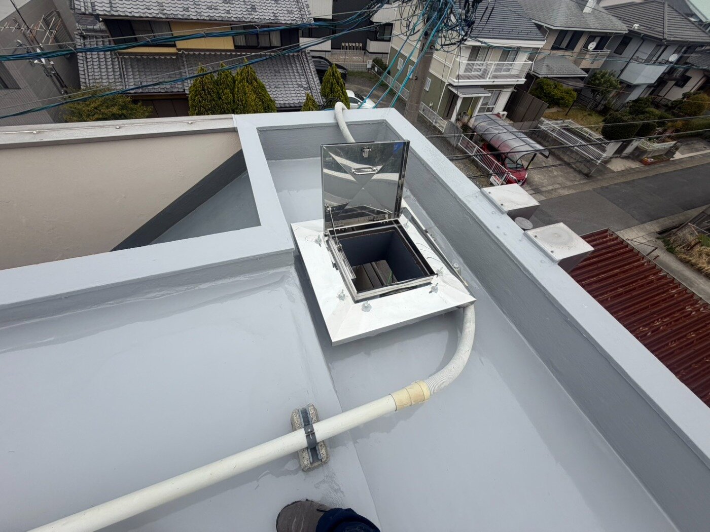 DETAIL Aマンション屋上防水改修工事 2026年04月04日(土) 今回の工事は 屋上防水→通気緩衝工法 点検口交換 軒天補修調色柄付け塗装 という内容となっております。 施工前 1 施工完了 1 施工前 2 施工完了 2 施工前 3 施工完了 3 施工前 4 施工完了 4